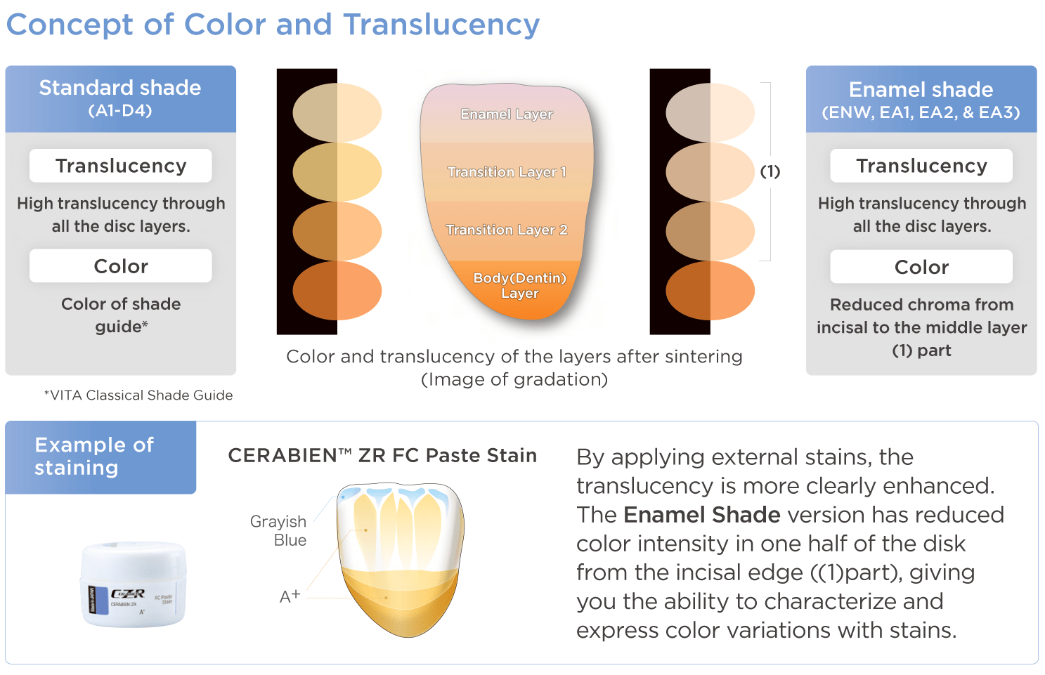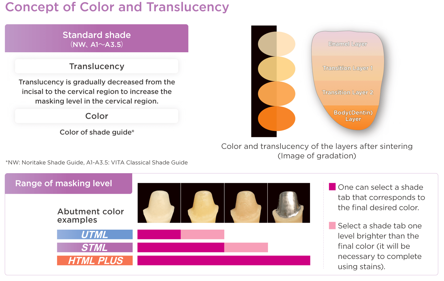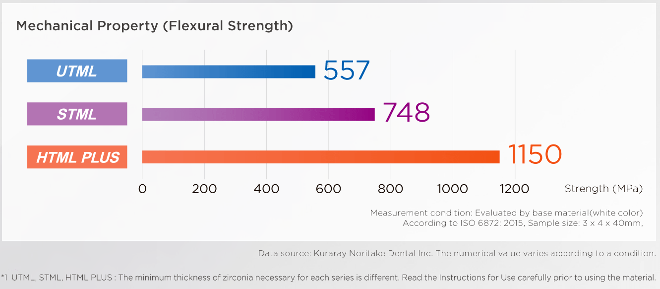 STML has a well-balanced combination of translucency and mechanical properties. This version of "KATANA™ Zirconia" has gradations of translucency as well as color, exhibiting a masking effect in the cervical area. Using this series, one can easily obtain the desired shades to accommodate the variety found in prepared tooth conditions of clinical cases.