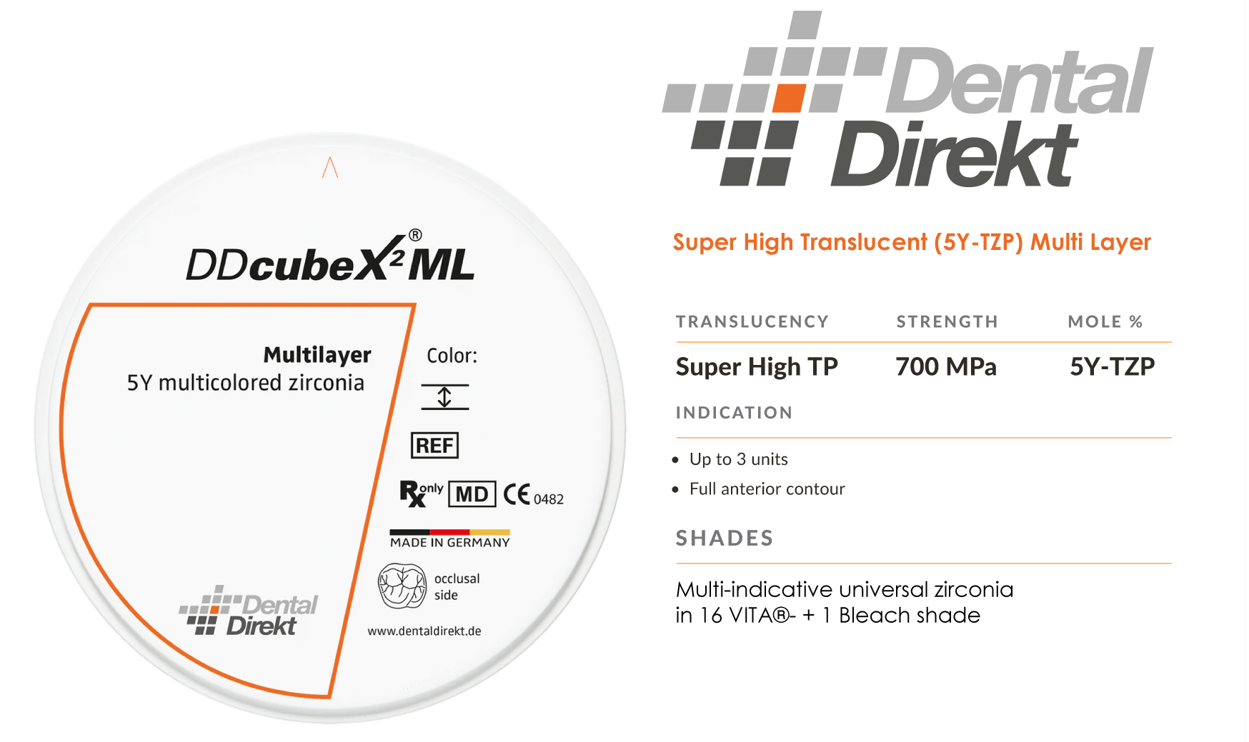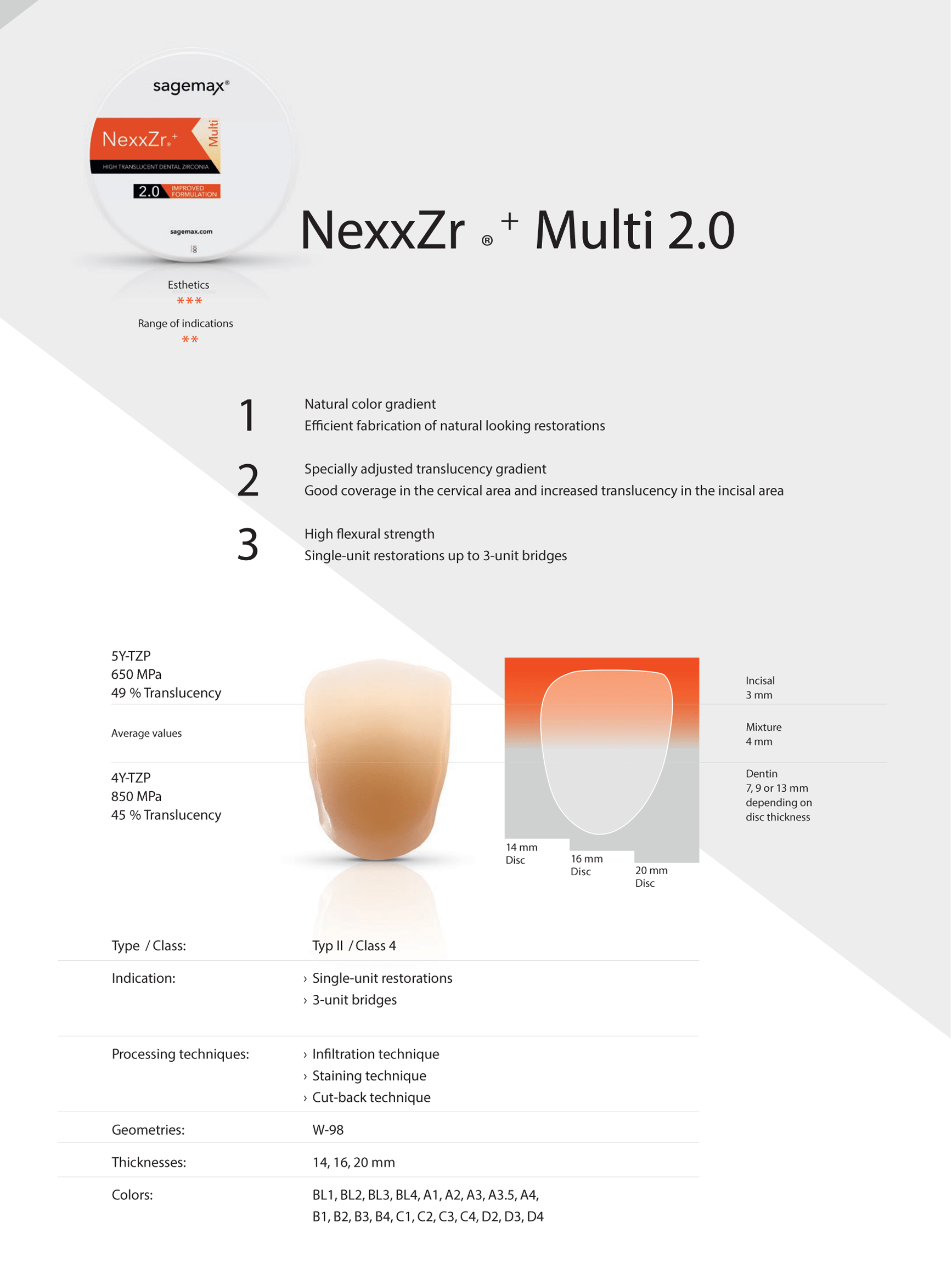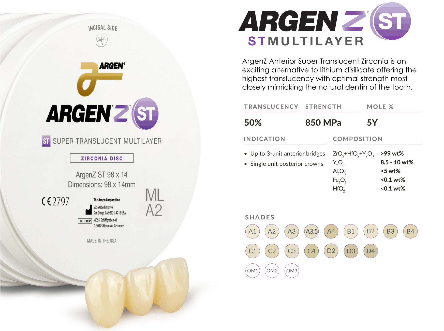 STML has a well-balanced combination of translucency and mechanical properties. This version of "KATANA™ Zirconia" has gradations of translucency as well as color, exhibiting a masking effect in the cervical area. Using this series, one can easily obtain the desired shades to accommodate the variety found in prepared tooth conditions of clinical cases.