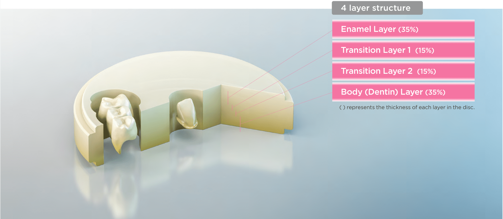 • The body under the support load is 1,100 MPa strength, and the occlusal requiring a transparent layer is 600 MPa, a Multi-Disc that reproduces both the chroma of the body and the transparency of the occlusal.