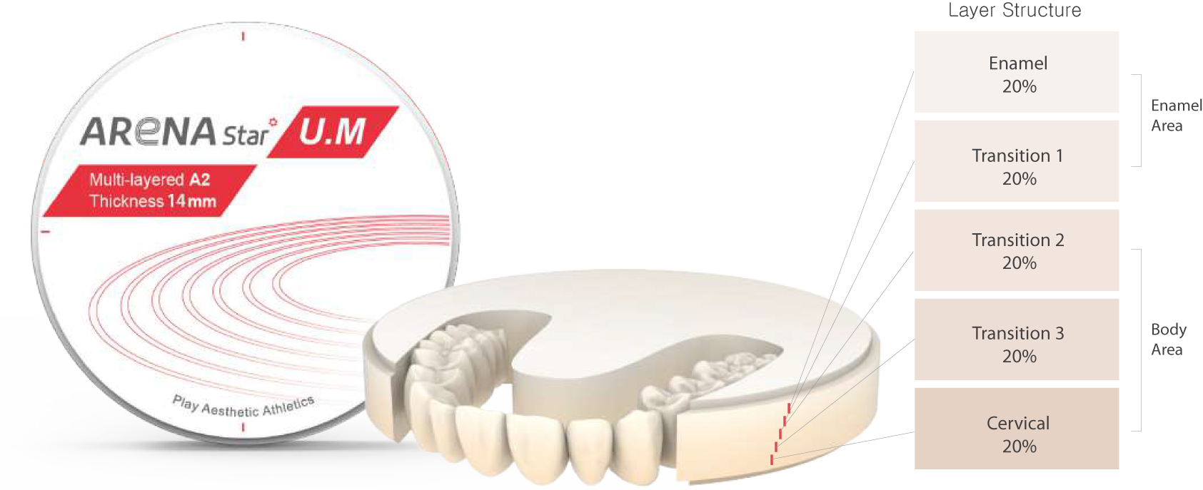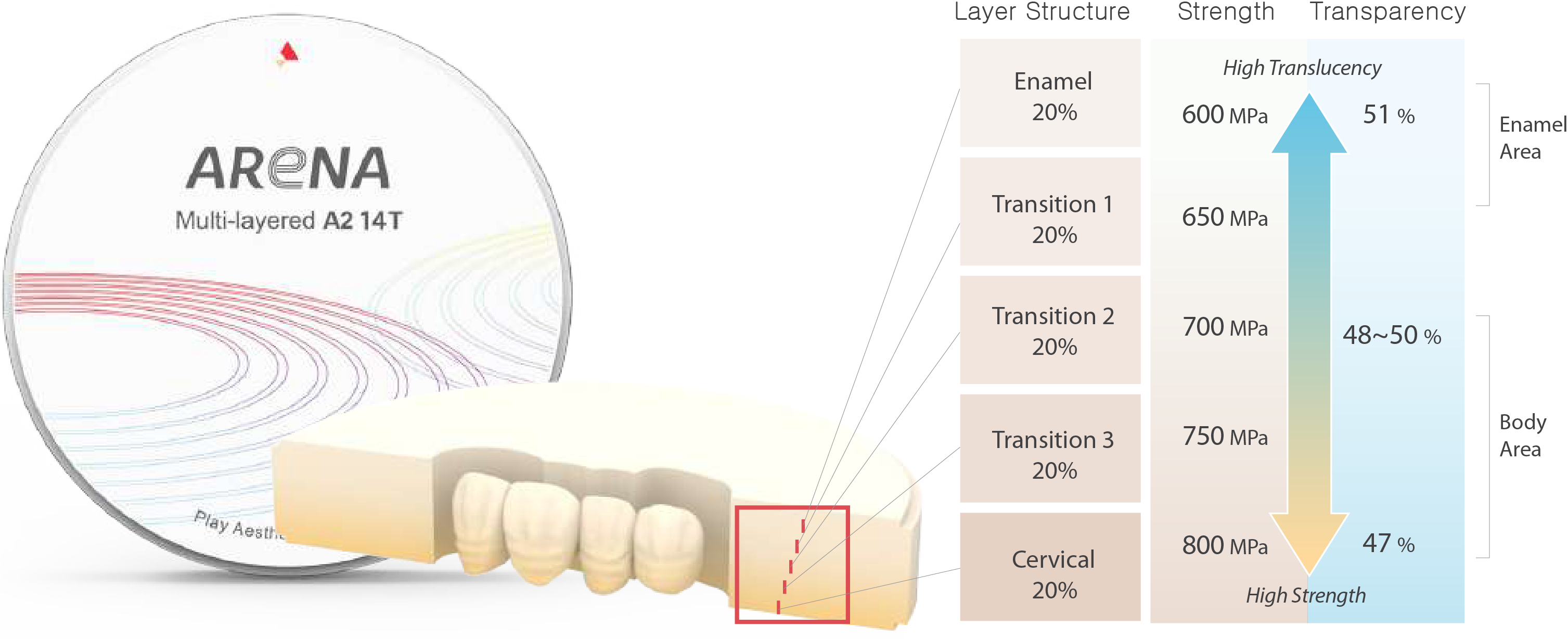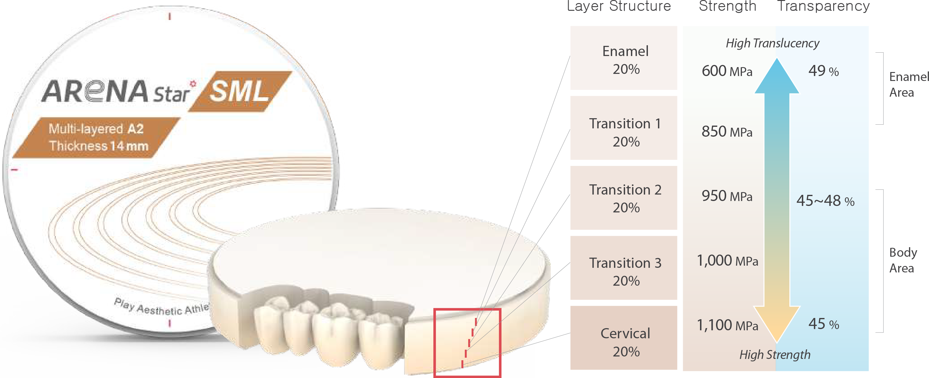 ARENA Star SML is a Multi-layer Discs with the stability and aesthetics of prosthetics. The Disc reproduces the aesthetic transparency of the prosthesis as well as the proper strength to withstand occlusal pressure. This innovative product is a zirconia disk that can easily and quickly express the aesthetic properties of natural teeth, which is best for making various types.