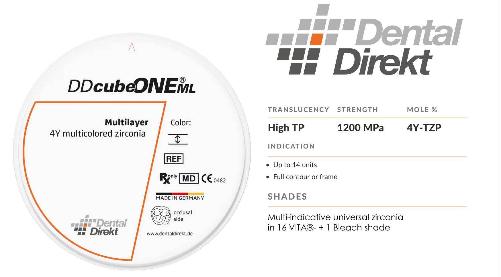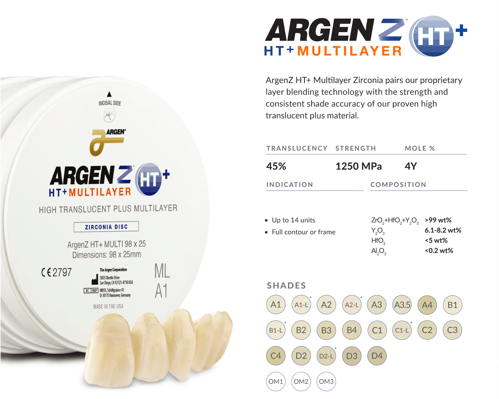 UTML has the most translucency among the "KATANA™ Zirconia" series, and is recommended for fabricating anterior crowns or laminate veneers. Two different shade types are available: Standard shade and Enamel shade.