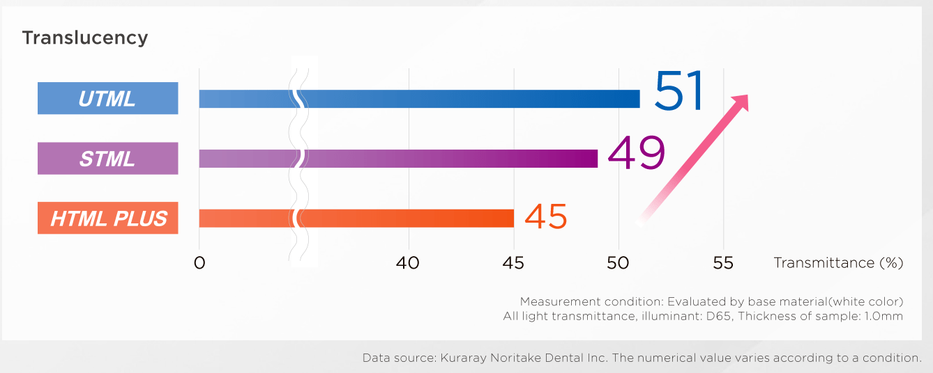 Our proprietary research and development has increased the translucency of "KATANA™ Zirconia" UTML more than conventional zirconia. This enables you to have natural translucency.